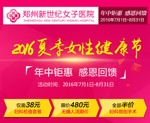 引言:2016年7月1日起,郑州新世纪女子医院率先在全省范围内推广“妇科规范化诊疗”体系,浓情启动“2016夏季女性健康节暨年中钜惠、感恩回馈”公益助医活动,妇科检查套餐38元,治疗援助500元,可尔依无痛人流限价480元,微创手术费全部半价等,为河南女性健康保驾护航。