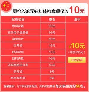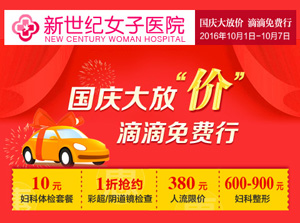 十一黄金周,郑州新世纪女子医院浓情推出“国庆大放‘价’ 滴滴免费行”关爱女性健康活动:价值238元的妇科体检套餐仅需10元,彩超、阴道镜检查1折抢约,阴道护理限价50元/次,可尔依保宫无痛人流限价380元,妇科整形限价600-900元,石女再造手术费半价,宫外孕等妇科微创手术费半价,预约尊享滴滴专车免费接诊,为河南女性健康保驾护航。